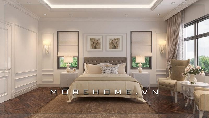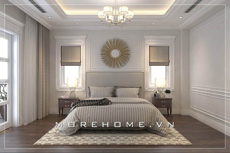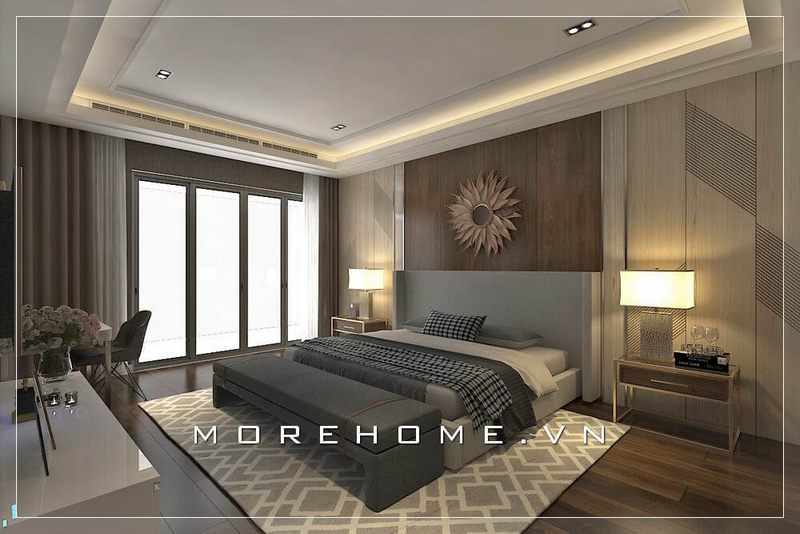 Giường ngủ bọc da đầu giường sang trọng, gia chủ lựa chọn màu xám lông chuột tạo điểm nhấn hài hòa hơn cho không gian