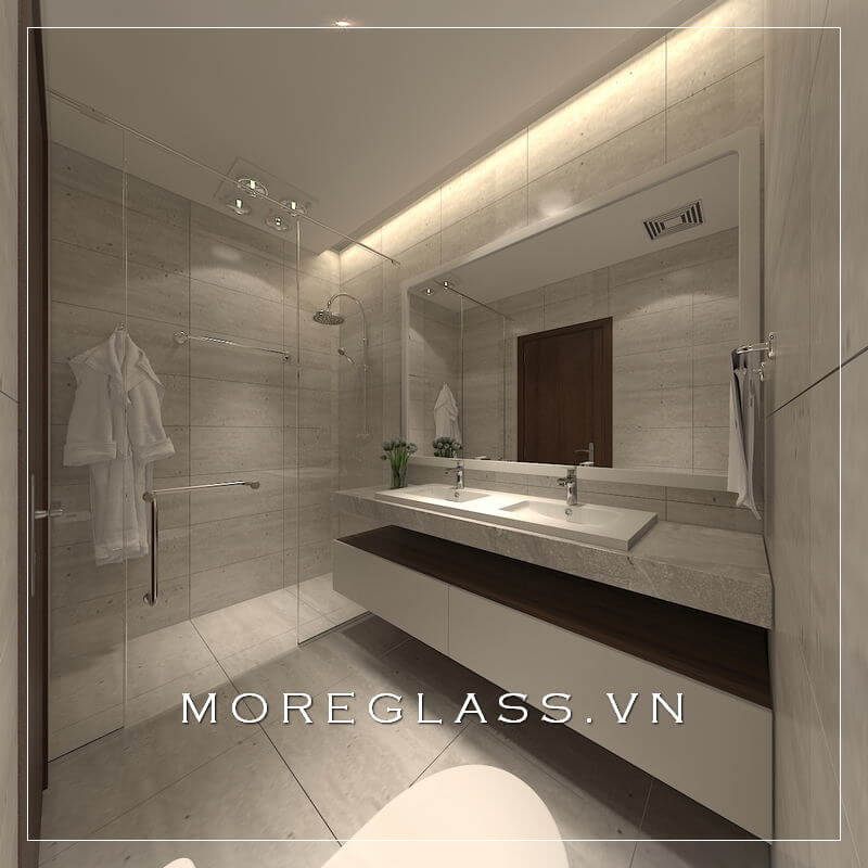 Mẫu thiết kế phòng kính cường lực trong suốt được sử dụng để phân chia hai không gian tắm và khu vực vệ sinh, giúp ngăn chặn nước không hắt vào nội thất.