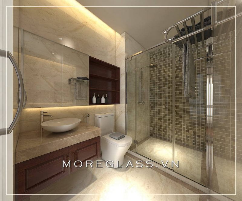 Phòng tắm hiện đại được thiết kế với những kệ tủ trang trí, tủ lavabo đơn giản nhưng hiện đại, cùng với các thiết bị vệ sinh và phòng tắm kính đẹp.