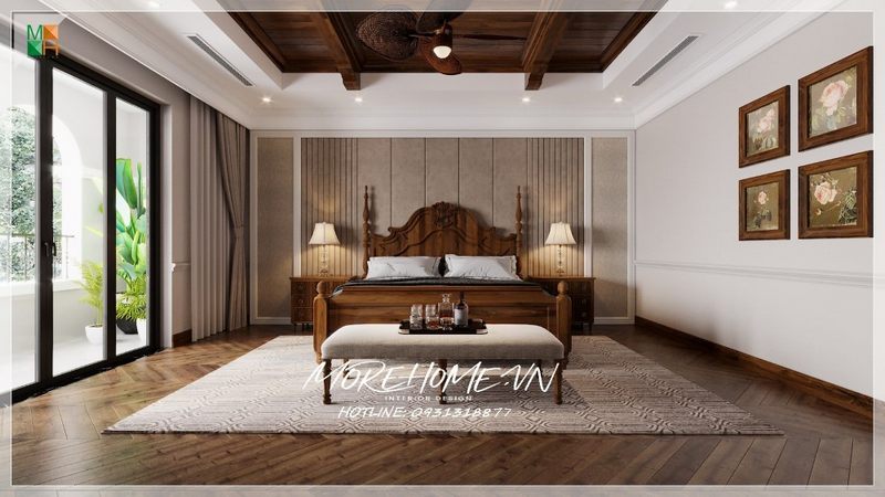 Phòng ngủ có diện tích lớn được trang bị nội thất bằng gỗ óc chó nhập khẩu cao cấp với phong cách tân cổ điển sang trọng.
