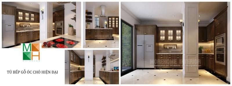 Tủ bếp chung cư cao cấp được thiết kế bằng chất liệu gỗ óc chó nhập khẩu sẽ tạo nên sự sang trọng, tinh tế và đẳng cấp, gu thẩm mỹ cho ngôi nhà của chủ nhân.